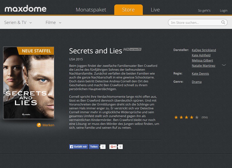 - The drama series "Secrets and Lies" is currently exclusive to the Video-on-Demand provider Maxdome Germany available.