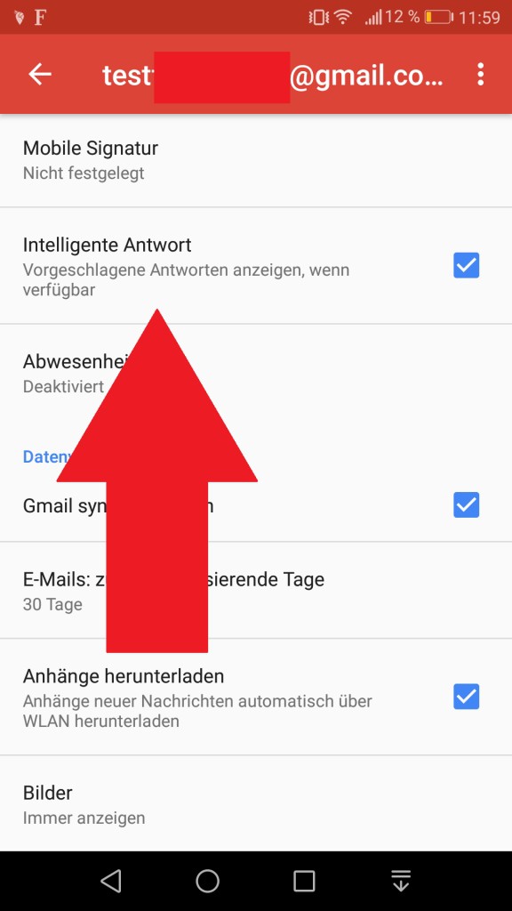- Smartphone: Open the Gmail App on your phone and select the top left in the menu "settings". Tap your e-Mail address and uncheck the Option "Intelligent response".