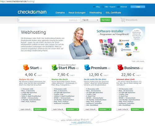 - Check domain also offers web hosting packages: Using the package "boot 4.0" you will get at the time of check domain is a Domain is included and can operate up to three Domains. Check domain provides you with a storage space of 5 GB available, and you can set up to 500 e-mail mailboxes, SPAM and virus protection, as well as five MySQL databases. In addition, you have the choice between PHP, Perl and Python. The "boot 4.0"-Webhosting, there are check domain starts at 4.90 euros per month, plus a one-time setup fee of 9,50 Euro. The minimum term is three months. The most comprehensive package currently costs 22.90 Euro per month. In addition, check domain SSL offers certificates. To create a Homepage, you can select specific packages, what Software should be installed. So for example, you have the choice between WordPress and Joomla. This makes the setup particularly easy. In addition, a separate e-mail addresses available to you.