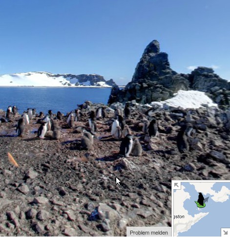 Is Pegman at this point, on the Antarctic Livingston island positioned, he turns into a penguin. But that's not all, because you can move to the place now, in the same way as on a street in Street View Fort.