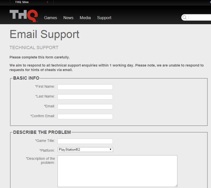 - With THQ Germany, no contact is not possible. You can only an Online form with THQ USA contact. Here you must write your request in English. Fill in the fields accordingly. "Submit" to submit your request.