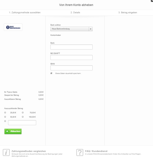 - Once you have a total of at least 25 Euro on your Tipico account, you can withdraw money. The processing time is two to three days, since each payment is checked by a staff member.