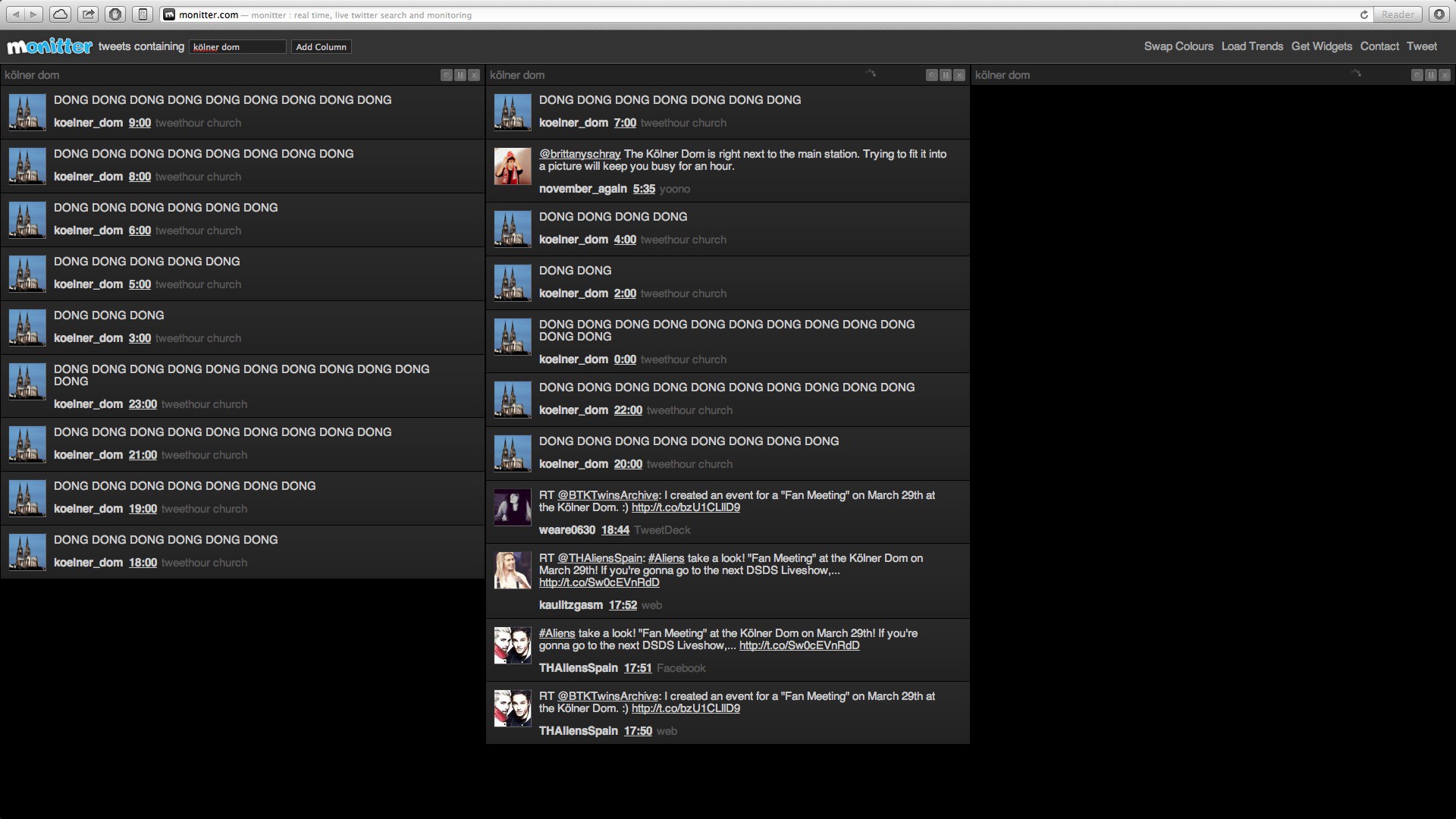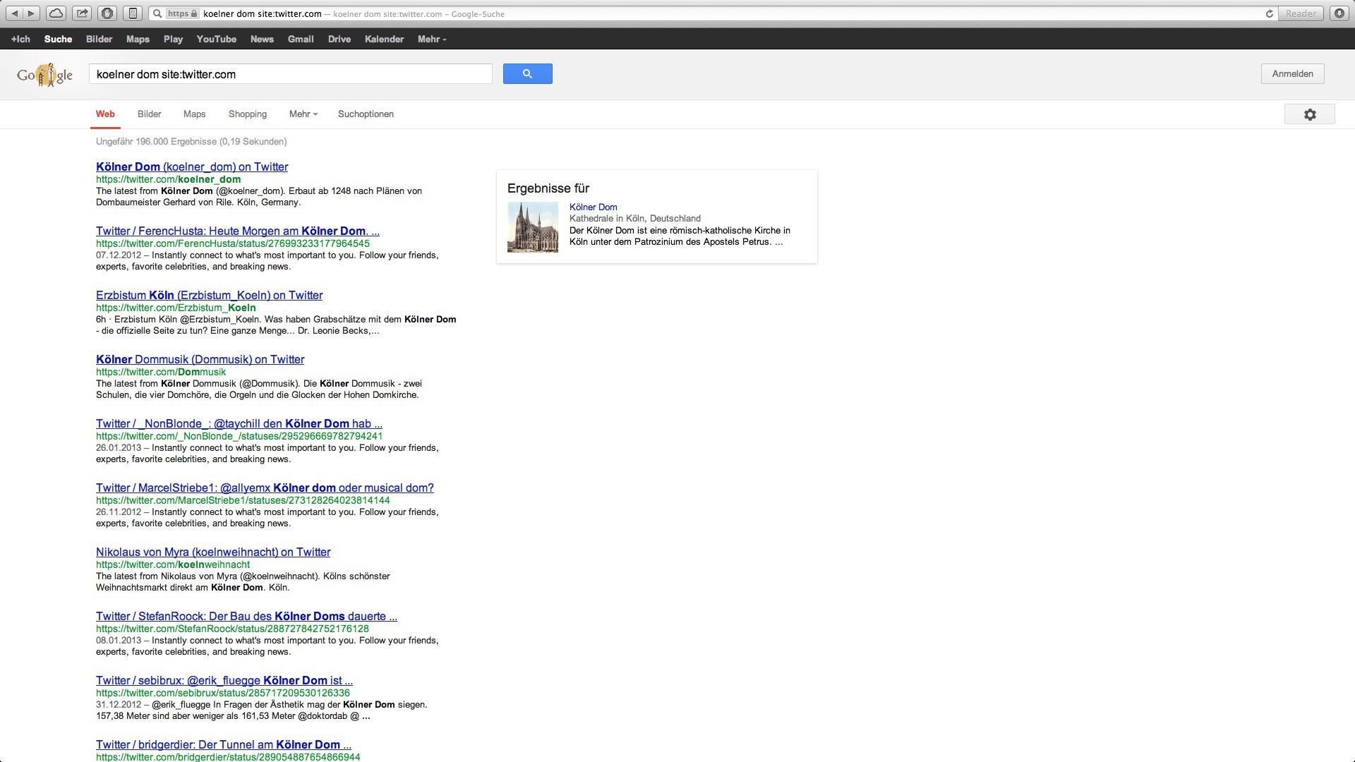 Since 2010, Google indexed all of the Twitter results in real-time. You just need to know how to feed Google with a Site query. The term "Koelner Dom site:twitter.com" we are looking for all Tweets that include the terms "Kölner Dom". Be taken into account both user Accounts as well as individual messages. A little tip: If you click in the Google search results page, "pictures", you also get the photos that were in connection with the Cologne Cathedral tweeted.
