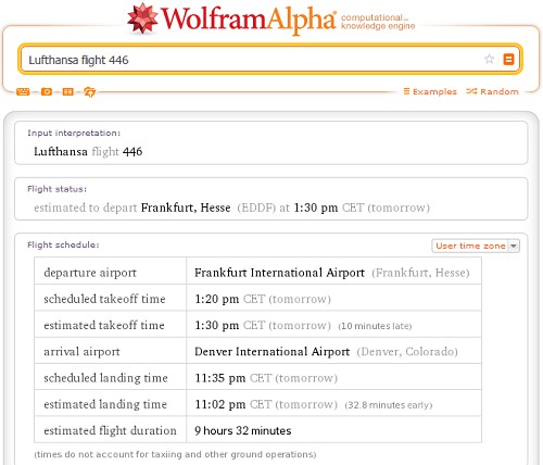 If you have booked a flight, or at least plan, you can get in Wolfram Alpha, quite simply, with the flight number, Details about your flight no matter what Airline. To do this, you simply enter the airline, then the key word "filght", and finally the flight number.