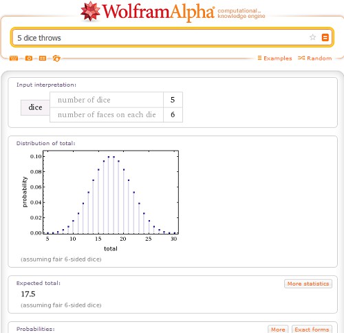 - Not only as a gambler, you could roll the dice of interest, for example, how high the probability is, five times in a row a 6 to. These and other probabilities, you can calculate easily with Wolfram Alpha. To do this, you type with known probability problems such as coin or dice is simply the English Translation (see Screenshot).