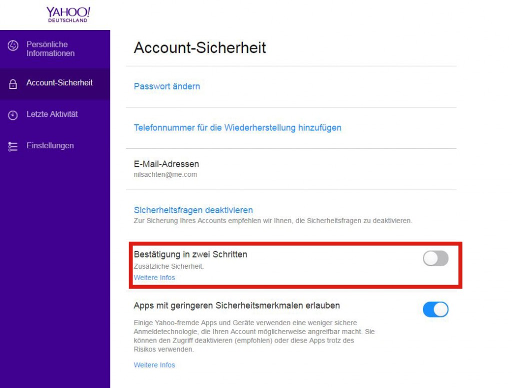 To make your Yahoo Account more secure, we recommend you to disable the security questions. The questions are usually so simple that you could even answer your neighbor. Yahoo has long supported the Two-way authentication. Here you will get each new device that you want to log in, an extra security Code on your phone. To enable this feature, follow these steps: