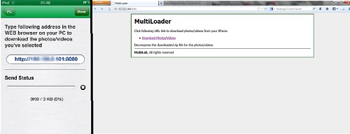 - A ZIP package is created. Tap again on "Send". You will now be shown an IP address, you need to enter in your web browser on the PC. You can also save this address as a favorite, because it is always the same.