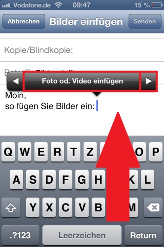 As of iOS 6 it is possible to insert images directly in the Mail App. You have an older Version of iOS, open the photo App, select an image, click on the arrow icon and select "Mail". The following instructions refer to the procedure under iOS 6: