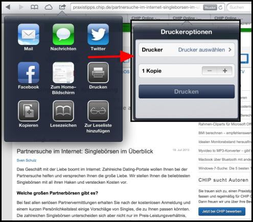 - Touch the menu in an App (such as Safari), the "use"(see image). Here, you can now select Print"".