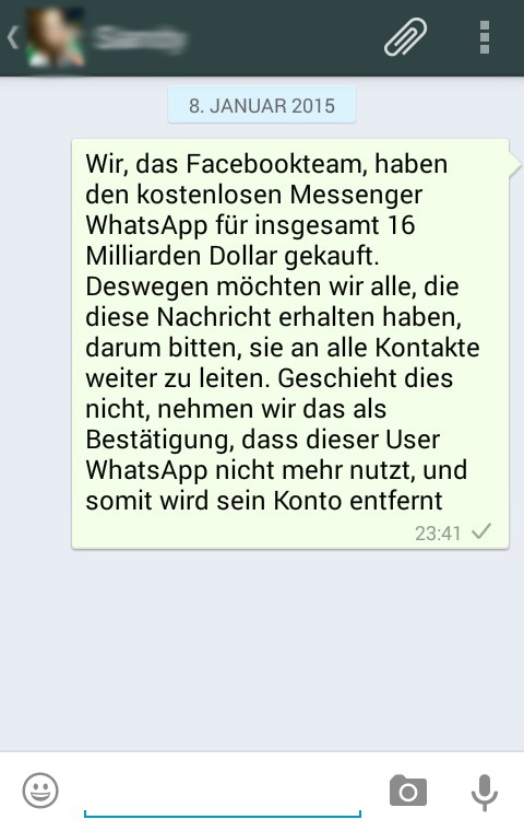 - You should note that WhatsApp already costs an annual contribution. Even after the purchase by Facebook, this will not change in the foreseeable future. If it is, is not made the announcement securely by means of chain mail made public. Hoaxes (hoaxes), as this may not take you seriously. To avoid panic, you should not forward the message. The chain letters are false, you can detect most of the incorrect grammar and spelling.
