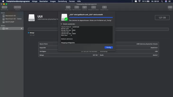 Then click Erase and Mac will start working. With the completion of the work, you have formatted your external hard drive. It is then ready for use and you can use it on both Windows PCs and Macs if you have selected ExFAT as the file system.