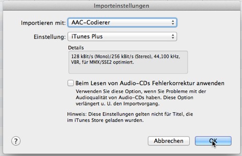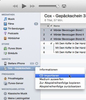 - Click with the right mouse button on the CD in the sidebar. Select the "CD import", and click the import settings, click "OK".