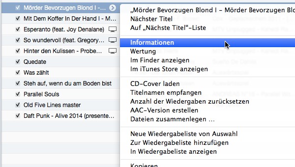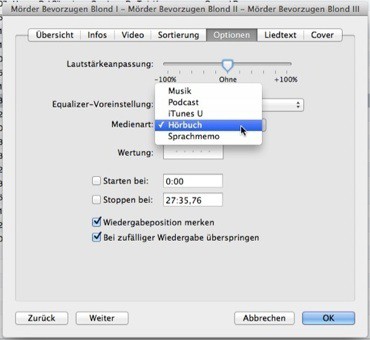 - Click with the right mouse button on the newly imported Track. Select "information". To set under the options Tab, the media kind to "audiobook". Put a check in the "playback position" and "In a random skip play".