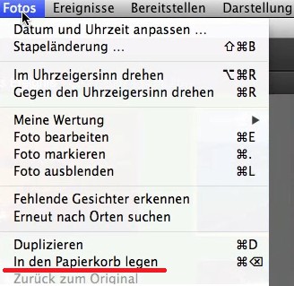 - Now select in the menu bar under the Option "photos" command "In the trash out of place" to move the selected images to the trash.