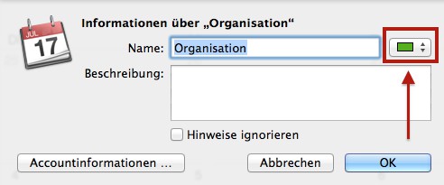 - In the displayed window you see next to the name of your calendar, a field for the color (See picture). Select your favorite color and then press "Ok".