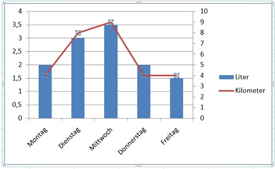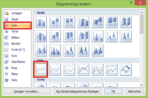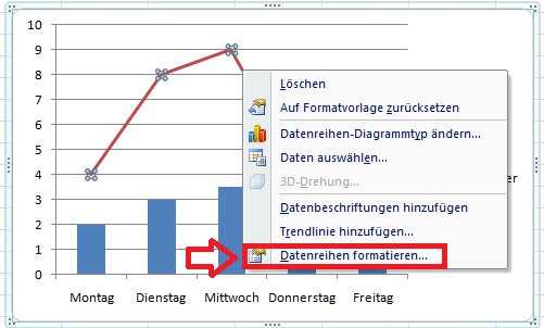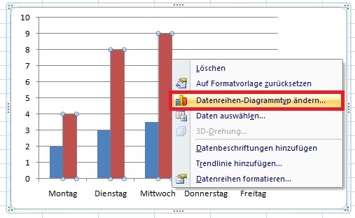 - A chart will be created for you. Click the column chart to a bar value. After you have marked out, for example, the red columns, click with the right mouse button on the marker. Select the rows of the "data change chart type...".