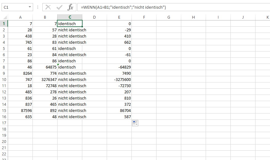 - In the column next to the two that you want to compare, enter in addition to the top-filled-in field, use the following formula: "=IF(A1=B1;"identical";"non-identical")"