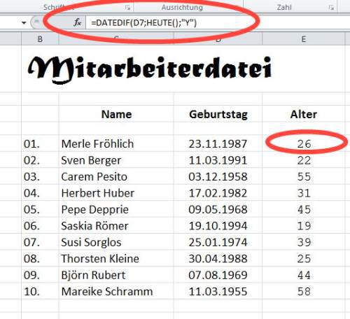 - In our example, we have started in the seventh row, the employee names are in column [C] entered, and the associated date of birth in column [D].