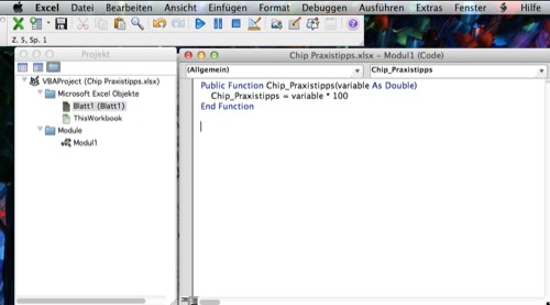 - Enter your function. Don't forget, at the beginning of "Public Function *function Name*" and at the end of "End Function" add. You should use the function name no umlauts or spaces.
