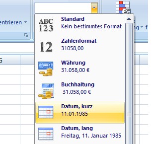 - Under "Start" in the menu bar you will find in the field "number" the Format of the cell. Here you should select depending on the Format, "short date" or "long date".