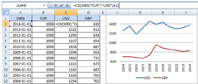 This handy Add-in allows you to over 160 international currencies in Excel convert. The exchange rates are updated in the free version daily. For EUR 10.00 per month upgrade and can shorten the interval to 1 Times per hour.