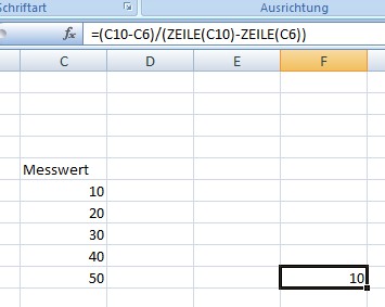 - Now click in a free cell and enter, for this example, the following formula in the top function bar: "=(C10-C6)/(ROW(C10) ROW(C6))" - of course without the quotation marks