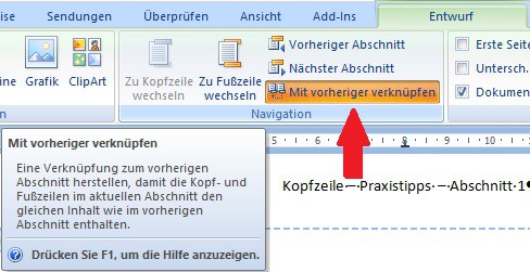 - Above the header you will find under the menu-section "Navigation" and "link to previous". Click on it to separate the header lines from each other.