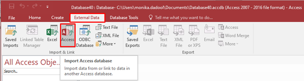 - In the Microsoft Access application, click the External Data option and then click on the Import Access Database button.