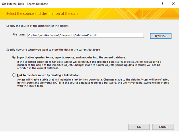 - In the same window, click on the “Import tables, forms, reports, macros, and modules into the current database” option
