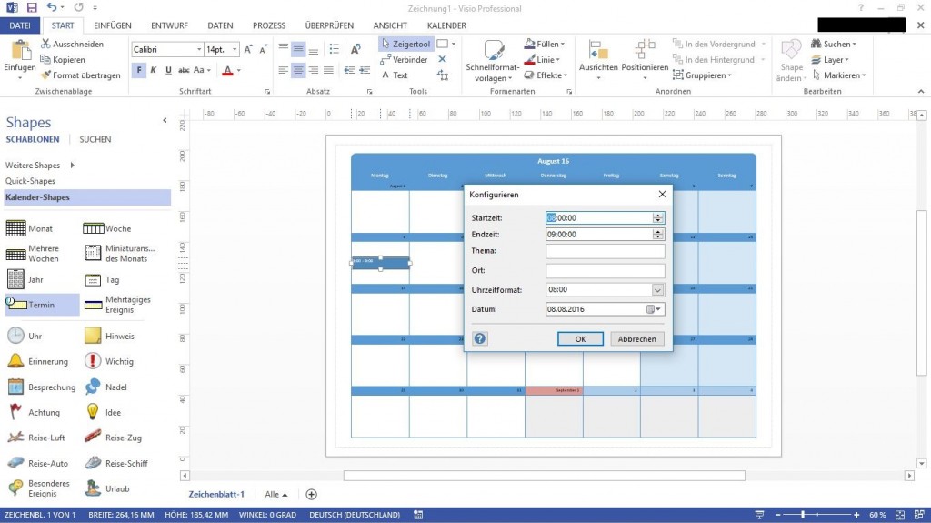 - The calendar Shapes for the month or week view, you can drag the templates from the left on the drawing sheet. You can then configure the month or the week in the opening Pop-Up window.
