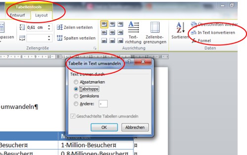 - Now you can set in the dialog box "tables in Text convert", whether the entries of your table are to be separated in the Text by paragraph marks, tabs, semicolons, or freely chosen characters. Confirm your choice with a click on "OK" and your table is converted to Text.