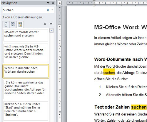 With the Word-search, browse all files. You can either browse the whole document, the query for individual pages or start your search on the Headings limit: