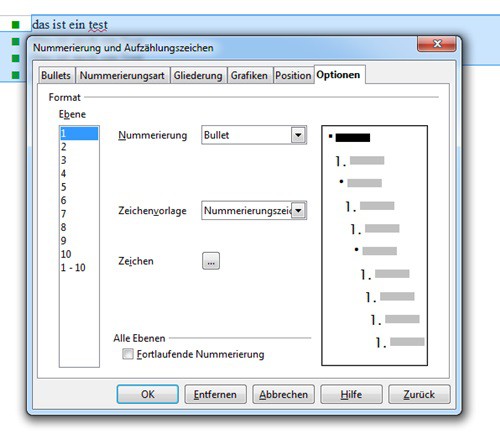 - In the tab "options" you can select under "character style" you are editing a template to change the color of the bullets. On the individual levels, you can also select different colors for different points. Finally confirm with "OK".