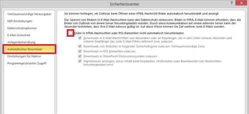 - You remain in the menu "Automatic Download". Remove the top hook in "images in HTML messages or RSS items don't automatically download".