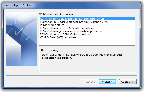 - In Outlook, click the top left tab "file" and select Open in the following window the field "and the Export".