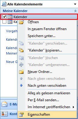 - In the left menu column, you will see under "My calendars" your(s) Outlook calendar. Now click with the right mouse button on the entry and select the context menu "properties" (see image).