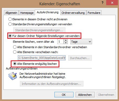 - In the settings you find in the third place the tab "AutoArchive". Select the "For this folder, the following settings use".