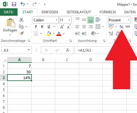 - For example, In the field A1, a 7, in A2, a 50 is. In the field of A3, we divide the two Figures mixed up with the command "=A1/A2". Thus, the result is displayed in percentage, we click at the top of the tab "Start" is the percent Button.