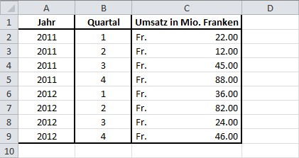Before you can create a Pivot table, you must enter your data. In this example, a sales Overview per quarter of a year. To do this, create a table in Excel with the columns year, quarter and sales revenue, in million Swiss francs (see graph).