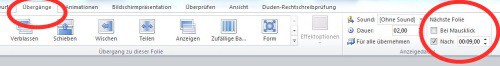 - Now you go into the quick launch bar. There you deactivate the Option "on mouse click" under "advance slide" and activate the Option "after" (see image). Finally, only the desired time to enter and you have to put your digital Countdown finished.