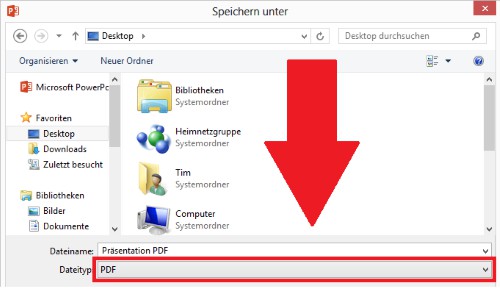- Powerpoint 2013, 2010, 2003: Open the Powerpoint presentation and click on the top left of the screen to "file" and then click "Save as". In Powerpoint 2007, you find, instead of the "file" Option in the "Office"Button.