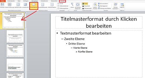 - Click the thumbnail to the left on the slide master, you see in the preview of the film with the allocated Standard Layouts that you can edit.