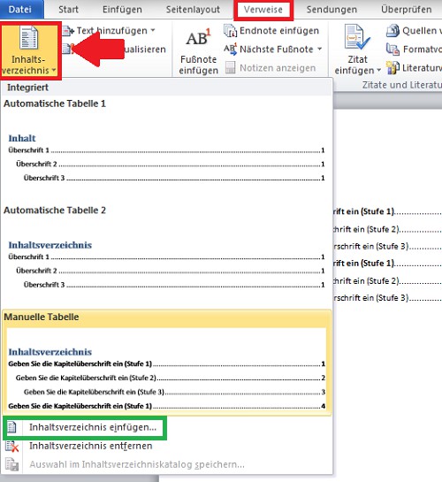 Search the Internet for additional templates for Word contents of directories, you hardly on useful Links. The protracted search can be avoided by you miss the pre-defined templates to easily add your own touch. This works well when you click the Button "insert table of contents..." (see green highlighted box in the Screenshot above) and then the desired formatting.