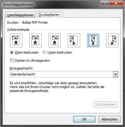 - Under the tab "print options" you can set how the envelope is to be entered in the printer.