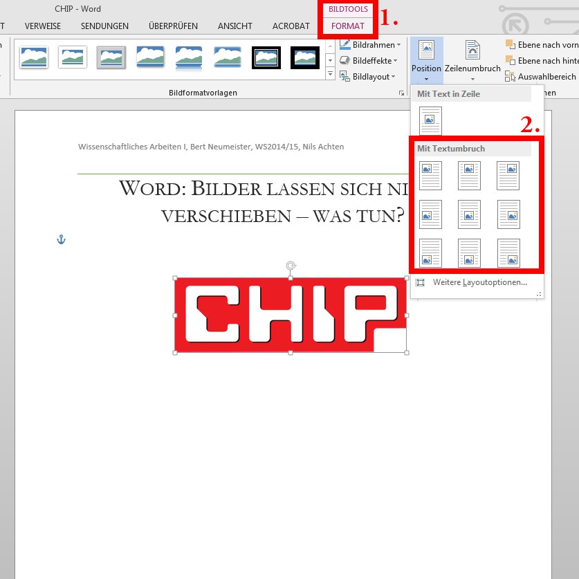 - Under the Option "Position" select under "With text wrapping" any Position, for example, "top left".