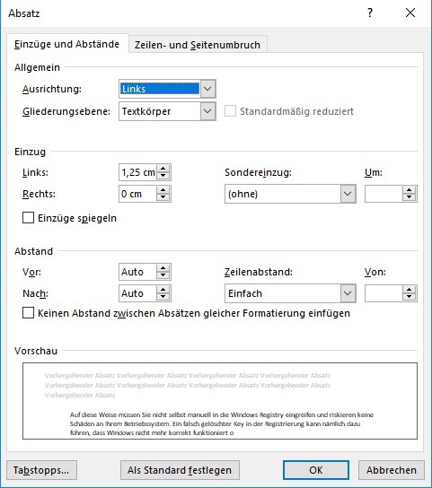 You do not want to adhere to the solid Tab, you can indent themselves in the Text to the millimeter: