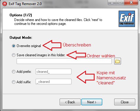 - In the next step, you can select whether you want to overwrite the originals ("Overwrite Original"), select a folder in the adjusted copies are stored, or the copies next to the original image with the addition of "cleaned" in the name of saving.