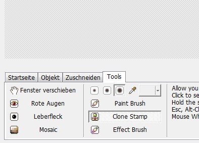 - Click in the bar at the bottom of the screen on the "Tools" tab and select the tool "Clone Stamp" and, depending on the image the appropriate size.