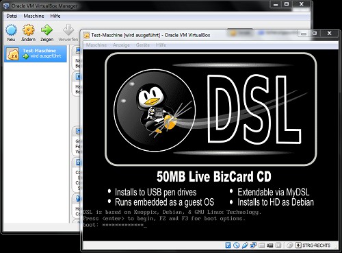 In our test run was VirtualBox 4.3.8 under Windows 7 and Damn Small Linux 4.4.10 as a second operating system installed.