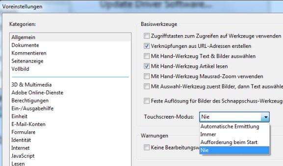 - You to change settings that slow down Adobe Reader. Via "edit" > "preferences" you can disable the message at startup, the server connection warnings, the the Touchscreen-mode, and fast searching.